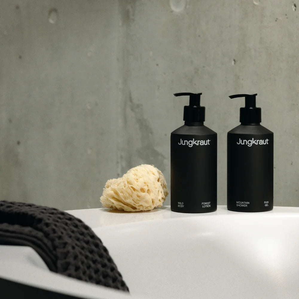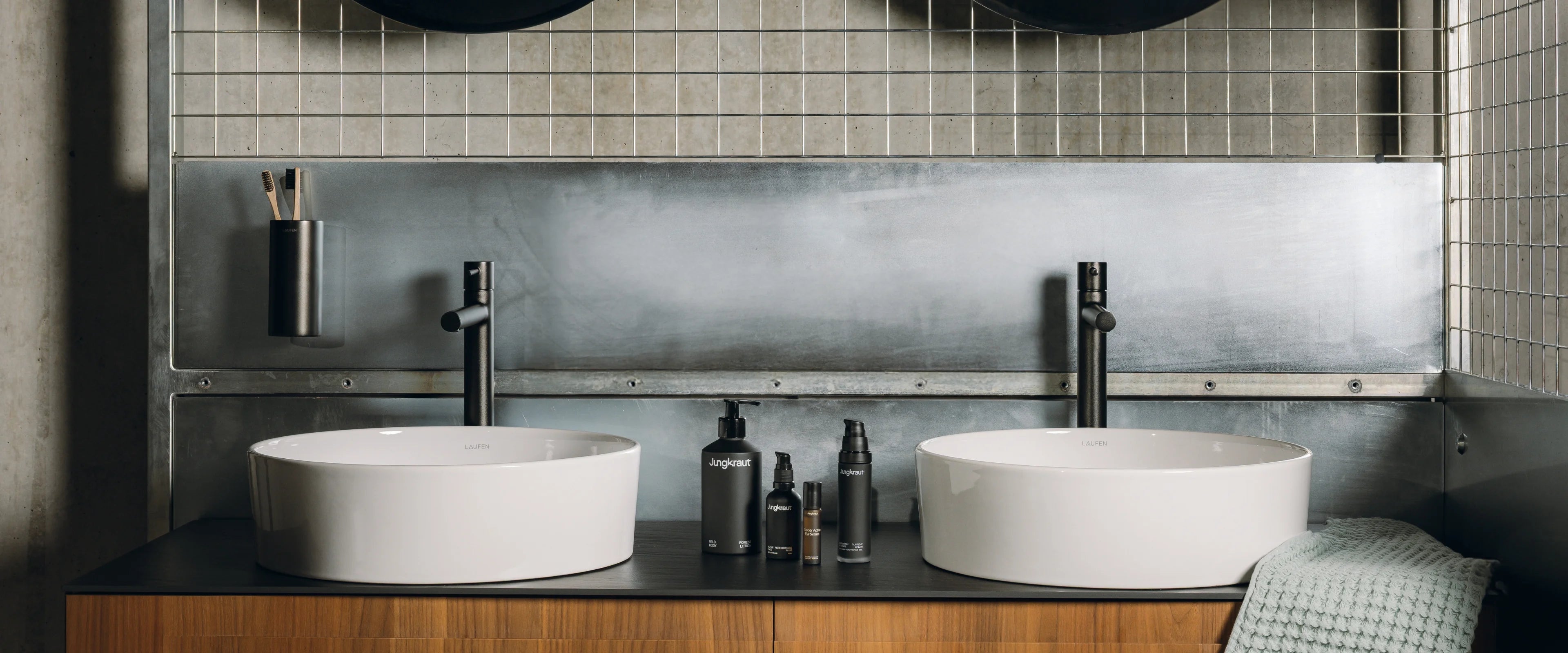 Both brands are firmly rooted in Switzerland. JUNGKRAUT develops highly effective natural skincare products made from alpine plant extracts, while LAUFEN has stood for iconic Swiss bathroom design for decades. Together, we harmonize origin, quality, and character – for men who value effectiveness and aesthetics.