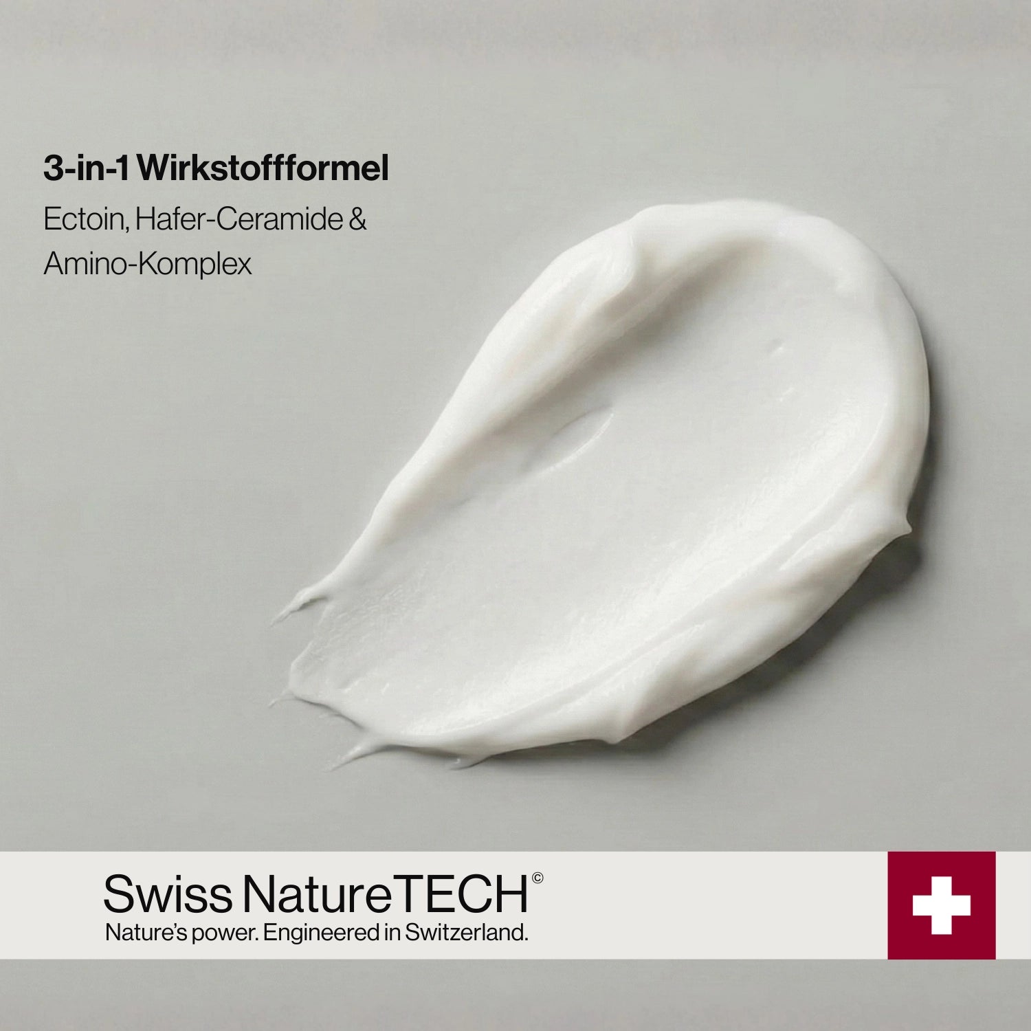 Basierend auf Swiss NatureTECH® kombiniert die Handcreme hochdosiertes Ectoin, reparierende Hafer-Ceramide, feuchtigkeitsspendenden Amino-Komplex und antioxidative Alpen-Botanicals.