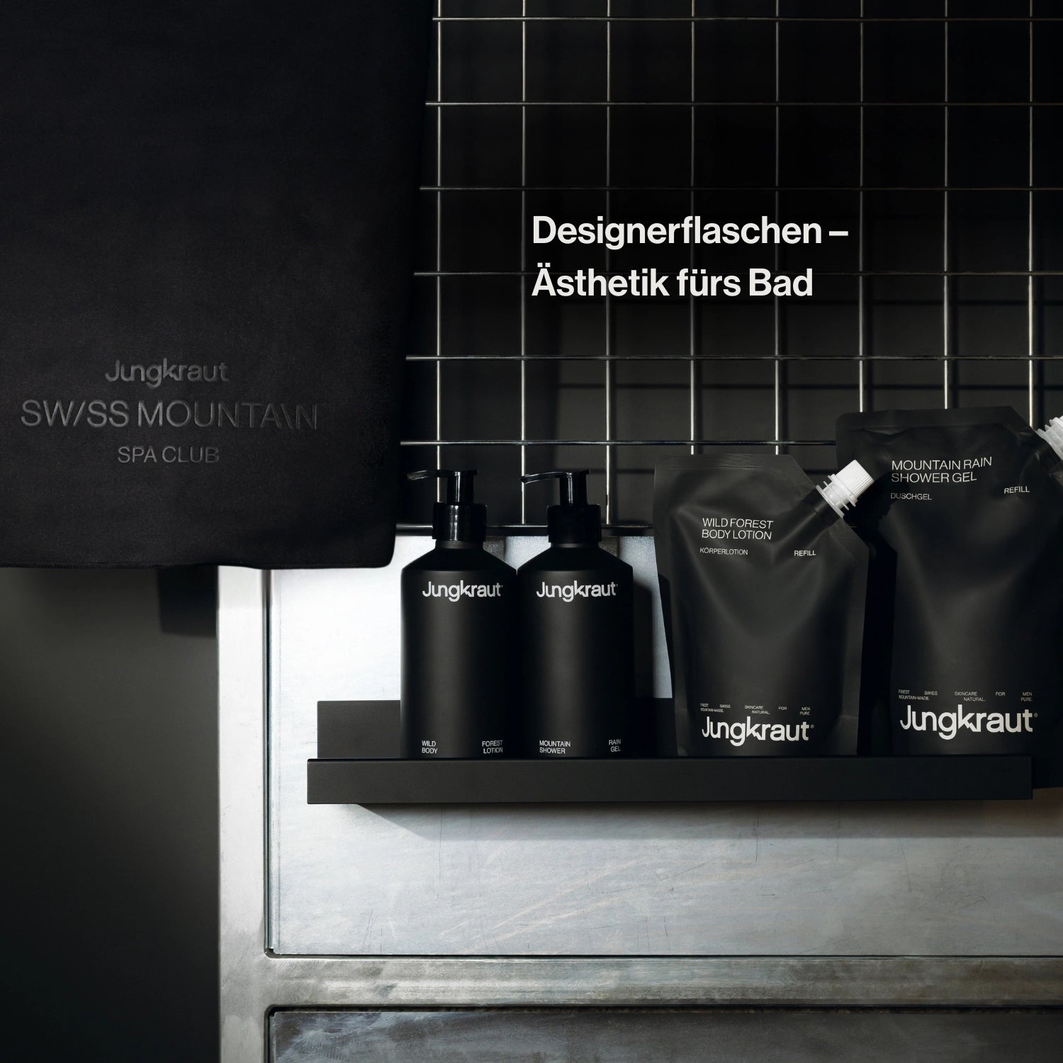 Die nachfüllbaren Designflaschen aus Aluminium sind langlebig, hochwertig und ein echter Blickfang im Bad. Mit den praktischen Refill-Beuteln lassen sie sich immer wieder auffüllen – für Pflege, die nicht plötzlich ausgeht. Ein gutes Gefühlt für deine Haut und die Umwelt.